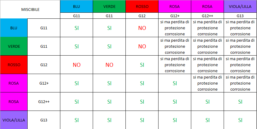 I liquidi antigelo sono colorati per aiutare l’utente a distinguere i liquidi da non mescolare tra di loro. La suddivisione per colori è una banale semplificazione visiva che non deve essere considerata per la scelta del corretto liquido con cui fare rabbocco. Lo standard corretto a cui fare riferimento è indicato nel libretto di uso e manutenzione (vedi sigle G11/G12/G12+/G13)