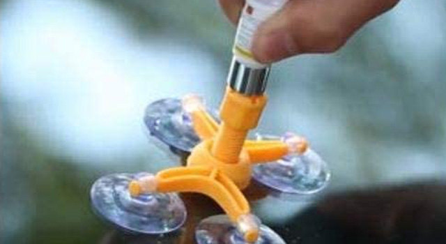 Rimuovere eventuali frammenti di vetro utilizzando la lametta in dotazione. Posizionare la base dell’applicatore sulla parte lesa del parabrezza centrando l’anello filettato sulla zona d’intervento. Far aderire bene le ventose, ma non posizionarle sopra eventuali fessure del vetro.