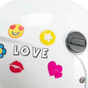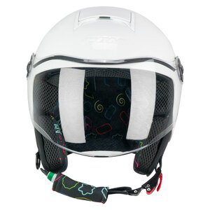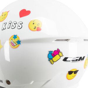 Casco per bambini, demijet leggero dalla calzata avvolgente. Calotta in HPT (termoplastica). Interni colorati estraibili e lavabili. Guanciali removibile con zip. Sistema di aerazione Air Stream System completo, visiera lunga che offre una maggiore protezione dal vento. Sistema di ritenzione: fibbia micrometrica. Anello antifurto. Elastico fermacinturino. Incluso nella confezione un foglio di adesivi, realizzato con una colla specifica adatta ad essere applicata sulla calotta del casco, che permette la personalizzazione del casco con emoticon e lettere dell'alfabeto. Omologazione ECE 22.06