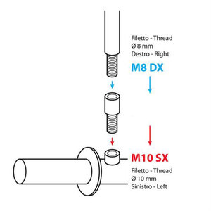 Adattatore per specchi moto. Filetto 8mm destro a 10mm sinistro. Filettatura passo 1,25mm