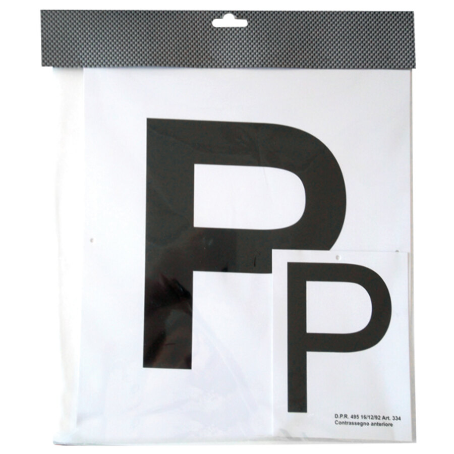 Contrassegno "P" Principiante. Set di 2 pezzi Anteriore + Posteriore a norma D.P.R. Adesività garantita. Ottima durata e resistenza nel tempo. Dimensioni anteriore: 11.5 x 15cm, dimensioni posteriore: 28.5 x 29.5cm