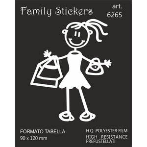 Soggetti stampati in bianco su foglio adesivo super trasparente che rappresentano singolarmente ed in modo stilizzato tutti i componenti della famiglia. Family Stickers è la dilagante moda del momento per decorare gli anonimi lunotti delle auto in modo distintivo ed elegante. Creare la propria decorazione è molto semplice: basta scegliere i soggetti che rappresentano il proprio nucleo famigliare ed applicarli sul lunotto posteriore dell'auto