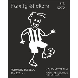 Soggetti stampati in bianco su foglio adesivo super trasparente che rappresentano singolarmente ed in modo stilizzato tutti i componenti della famiglia. Family Stickers è la dilagante moda del momento per decorare gli anonimi lunotti delle auto in modo distintivo ed elegante. Creare la propria decorazione è molto semplice: basta scegliere i soggetti che rappresentano il proprio nucleo famigliare ed applicarli sul lunotto posteriore dell'auto