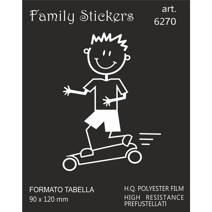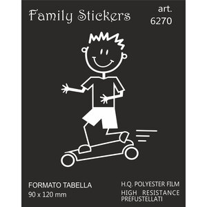 Soggetti stampati in bianco su foglio adesivo super trasparente che rappresentano singolarmente ed in modo stilizzato tutti i componenti della famiglia. Family Stickers è la dilagante moda del momento per decorare gli anonimi lunotti delle auto in modo distintivo ed elegante. Creare la propria decorazione è molto semplice: basta scegliere i soggetti che rappresentano il proprio nucleo famigliare ed applicarli sul lunotto posteriore dell'auto