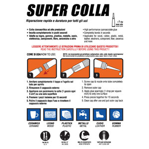 Riparazione rapida e duratura per tutti gli usi. Molto resistente. Tappo anti ostruzione. Colla cianoacrilica ad alte prestazioni. Incolla completamente in pochi secondi. Adatta su legno, gomma, plastica, metallo, cuoio, elettronica, componenti, fibre, ceramiche e altro