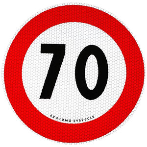 Contrassegno limite di velocità adesivo. Contrassegno adesivo rifrangente omologato Eu. Dettagli precisi, colori brillanti e ottima resistenza nel tempo. 70 km/h. Diametro: 200mm