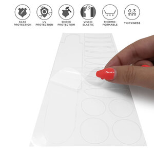 Pellicola autoadesiva trasparente dalle eccezionali caratteristiche protettive. Grazie al suo elevato potere ammortizzante è indicata per proteggere in maniera efficace, i punti più vulnerabili delle biciclette dai piccoli urti e dai continui sfregamenti dei cavi. L'elasticità e l'incredibile resistenza di questo prodotto realizzano una vera barriera che preserva e respinge le aggressioni meccaniche e chimiche che rovinerebbero la parte sottostante del telaio. La morbidezza e la sua elasticità ne consentono l'applicazione anche in punti curvi e bombati. Tabella composta da 14 sagome assortite e 1 batticatena