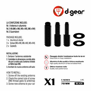 Antenna AM/FM in alluminio universale. Fissaggio diretto! Installazione facile fai da te! Alluminio di alta qualità e finitura anodizzata. Ottima ricezione radio. La confezione include: 1 antenna in alluminio, 3 Viti (M6 x M6, M6 x M5, M6 x M4), 2 guarnizioni. La misura é universale e si adatta alla maggior parte dei veicoli (ma solo quelli con una vite esterna per antenna di tipo base). Questa antenna non monta su veicoli del Gruppo FCA (Alfa, Fiat, Jeep...) con base antenna rettangolare, su Opel Crossland, Opel Grandland e Peugeot 2008. Misurare il foro della vite sulla base dell'antenna prima di acquistare il prodotto, un lato del diametro della vite è di 6 mm per l'antenna, l'altro lato è per la base dell'antenna