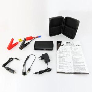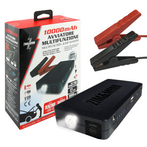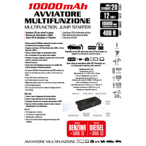 Avviatore 12V per veicoli in panne. Riserva di energia per smartphone e tablet. Torcia LED di emergenza. Fino a 20 avviamenti con una singola carica completa. Per veicoli a benzina fino a 5000cc Per veicoli diesel fino a 3000cc. 10000mAh. Avviatore compatto, leggero ma potente. Protezione di sicurezza multipla per prevenire corto circuiti, corrente eccessiva, sovracarico, sovrascarico. Morsetto di sicurezza. Torcia LED ultraluminosa incorporata con 3 modalità: SOS, strobo di emergenza e illuminzaione generale