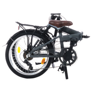 Bici pieghevole con telaio in alluminio. Forcella in acciaio. Manubrio in alluminio. Copricatena: plastica. Supporto inferiore: Neco B 910. Mozzo posteriore/anteriore: Shunfeng. Cambio: Shimano SL-RS36, 7 velocità. Deragliatore posteriore/anteriore: TY200. Ruota libera: ATA 7 velocità. Catena: KMC 27. Rim: Dacron Double Wall. Freno anteriore/posteriore: Promax V Brake TX-117. Portapacchi posteriore: acciaio. Ruote 20". Pneumatici 20x1,75. Peso 13,10kg. Dim. chiusa 80xh68x40cm