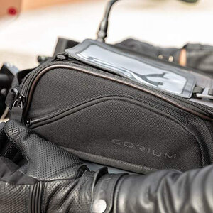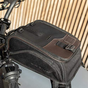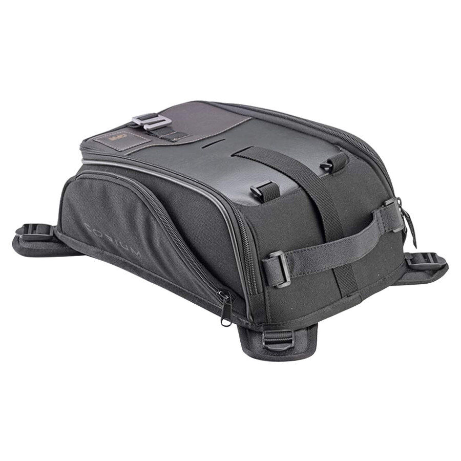 Borsa da serbatoio magnetica. Dal design classico è particolarmente adatta a moto stile retrò o cafè racer. Realizzata in poliestere nero grana grossa 1200D W/R ad alta tenacità. PU color moro e nero. 4 magneti estraibili per l'aggancio al serbatoio. 4 cinghie aggiuntive per permettere il fissaggio su serbatoi non metallici. 2 tasche laterali. Tasca removibile porta cellulare. Copertina antipioggia