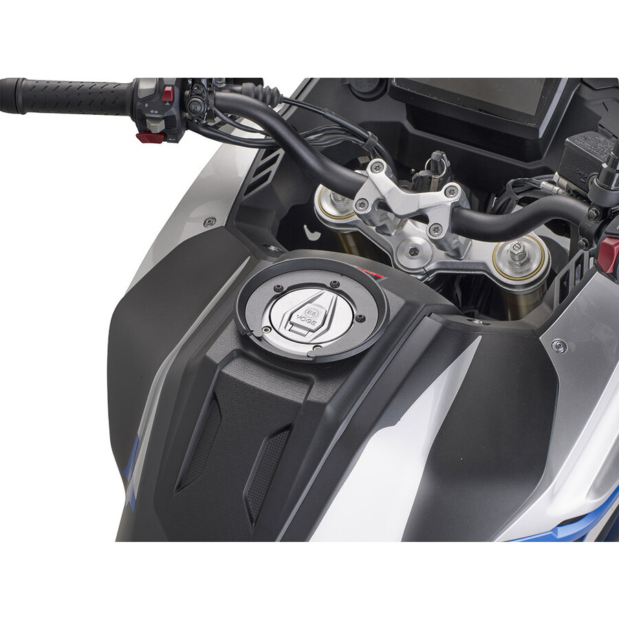 Flangia necessaria per la corretta installazione delle borse Tank Lock. Si fissa al tappo serbatoio; la borsa si aggancia applicando una semplice pressione