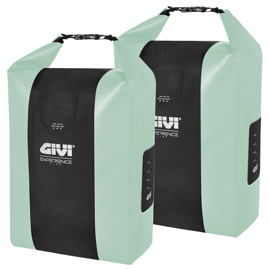 Per i cicloturisti più esigenti. Coppia borse laterali da 20+20lt che si caratterizzano per essere impermeabili ed estremamente versatile grazie al sistema di chiusura Roll-Top. Dotate del nuovo sistema di attacco universale Givi Rapido che permette di agganciare la borsa facilmente alla bicicletta. La maniglia posteriore e la fascia a tracolla removibile permettono di trasportarla comodamente anche a piedi. Internamente ogni borsa é dotata di tasca per laptop imbottita e rete portaoggetti. I patches laterali arricchiti da stampe riflettenti permettono di alloggiare la luce posteriore per aumentare la propria visibilità su strada. Il sistema Air Valve Technology ne facilita la fase di carico e ottimizza la capienza grazie alla fuoriuscita dell'aria in eccesso