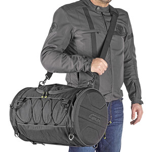 Borsa da coda a rullo. Sistema di attacco per mezzo di cinghie con doppi D-Ring sul fronte e sul retro della borsa e di una cinghia centrale di sicurezza alla base da inserire nel sottosella o sotto la coda. Materiali (realizzati secondo la normativa REACH): poliestere laminato PU, pareti laterali termoformate rivestito, ne aumenta la rigidità e la stabilità. Copertina antipioggia water resistant in materiale giallo fluorescente. Tracolla, Tasca laterale, Tasca posteriore. Tasca superiore. Entrata laterale aggiuntiva. Elastici multiuso a croce