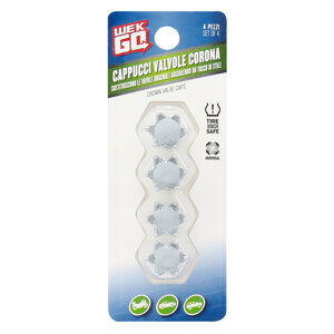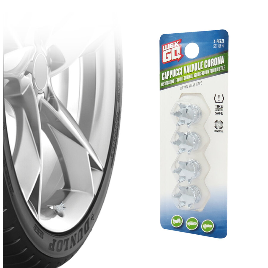 Cappucci valvole corona. Sostituiscono le valvole originali aggiungendo un tocco di stile. Design stiloso e lavorazione di qualità. Misura universale per la maggior parte delle auto, dei camion e delle moto. Guarnizione O-Ring interna in gomma per evitare perdite d'aria. Ottimo per sostituire i cappucci valvola usurati e con perdite. Diametro interno: 7mm