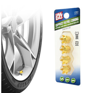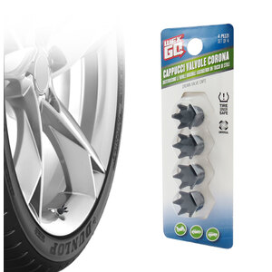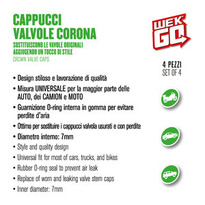 Cappucci valvole corona. Sostituiscono le valvole originali aggiungendo un tocco di stile. Design stiloso e lavorazione di qualità. Misura universale per la maggior parte delle auto, dei camion e delle moto. Guarnizione O-Ring interna in gomma per evitare perdite d'aria. Ottimo per sostituire i cappucci valvola usurati e con perdite. Diametro interno: 7mm
