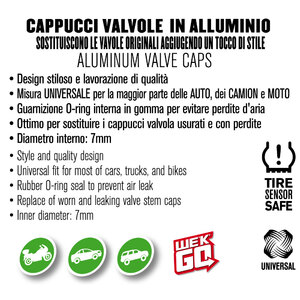 Cappucci valvole dal design stiloso e lavorazione di alta qualità. Misura universale per la maggior parte di auto, moto e camion. Guarnizione O-Ring interna in gomma per evitare perdite d'aria. Ottimo per sostituire i cappucci valvola usurati e con perdite. Diametro interno 7mm