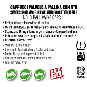 Cappucci valvole dal design stiloso e lavorazione di alta qualità. Misura universale per la maggior parte di auto, moto e camion. Guarnizione O-Ring interna in gomma per evitare perdite d'aria. Ottimo per sostituire i cappucci valvola usurati e con perdite. Diametro interno 7mm