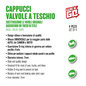 Cappucci valvole teschio. Sostituiscono le valvole originali aggiungendo un tocco di stile. Design stiloso e lavorazione di qualità. Misura universale per la maggior parte delle auto, dei camion e delle moto. Guarnizione O-Ring interna in gomma per evitare perdite d'aria. Ottimo per sostituire i cappucci valvola usurati e con perdite. Diametro interno: 7mm