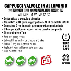 Cappucci valvole dal design stiloso e lavorazione di alta qualità. Misura universale per la maggior parte di auto, moto e camion. Guarnizione O-Ring interna in gomma per evitare perdite d'aria. Ottimo per sostituire i cappucci valvola usurati e con perdite. Diametro interno 7mm