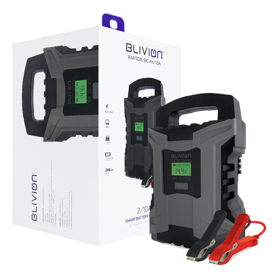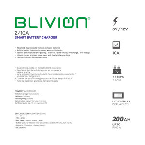 Caribatterie e mantenitore. Diagnostica avanzata per indicare batterie danneggiate. Desolfatore della batteria incorporato per recuperare le batterie scariche. Varie protezioni: inversione di polarità / surriscaldamento / cortocircuito / sovraccarico / sovratensione. Corrente 10A per offrire maggior potenza e ridurre i tempi di ricarica. Facile da trasportare grazie alla maniglia integrata. Fino a 200Ah. 6V - 2A. 12V - 2/10A. 7 fasi. Display LCD. Potenza massima 180W. Tipi di batterie: piombo acido (WET, MF, Ca/Ca, AGM and GEL). Connettore: morsetti