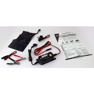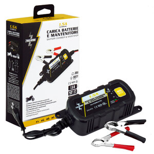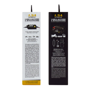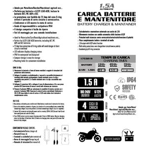 Caricabatterie e mantenitore universale con uscita da 1.5A. Rilevamento tensione con cambio automatico della funzione 6/12V. Protezioni multi-sicurezza: contro sovraccarico/cortocircuito/inversione di polarità. Pinze completamente isolate e terminali ad anello. Ideale per Moto/Auto/Barche/Macchinari agricoli ecc. Perfetto per batterie a 6/12V LEAD-ACID, incluse le batterie WET, MF, AGM e GEL. La protezione con fusibile da 7,5 Amp del cavo O-ring eviterà il pericolo di corto circuito o sovraccarico. L'indicatore a LED mostra lo stato di carica. Grado di impermeabilità e antipolvere IP64. Design compatto, facile da riporre. Fori di montaggio per una comoda installazione