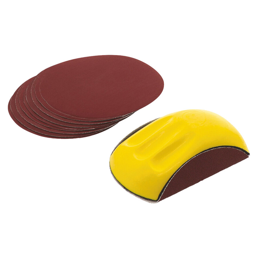 Cuneo di levigatora ergonomico. Consente la levigatura di stucchi e vernici dalle carrozzerie delle automobili. Il kit include: 1 cuneo di levigatura con chiusura a strappo; 2 dischi abrasivi grana 80; 2 dischi abrasivi grana 120; 2 dischi abrasivi grana 220; 2 dischi abrasivi grana 320; 2 dischi abrasivi grana 400