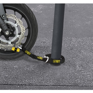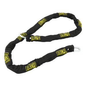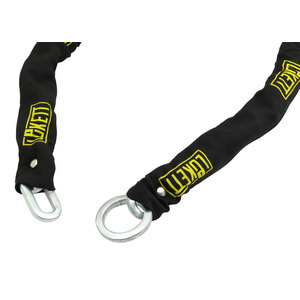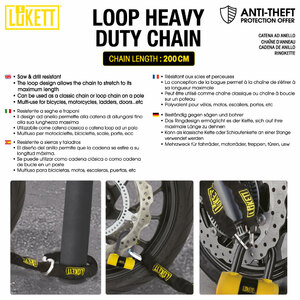 Catena ad anello. Resistente a seghe e trapani. Il design ad anello permette alla catena di allungarsi fino al suo massimo. Utilizzabile come catena classica o catena loop ad un palo. Multiuso per motociclette, biciclette, scale, porte, ecc. Lunghezza 200cm. Spessore 10mm