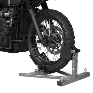 Cavalletto a cuneo per ruota anteriore. Adatto a ruote da 38>53cm. Progettato per essere usato in caso di trasporto, manutenzione e per un parcheggio sicuro. Completamente regolabile per adattarsi alle dimensioni delle ruote da 15" a 21" (da 38cm a 53,34cm). L'alloggiamento autobloccante della ruota utilizza il peso della moto per mantenersi in posizione verticale. Per eseguire le operazioni di carico e scarico è sufficiente una persona sola. Facile da assemblare