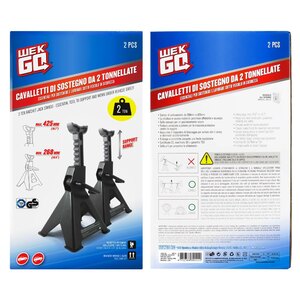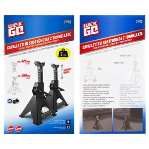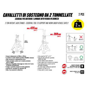 Cavalletti di sostegno da 2 tonnellate. Essenziali per sostenere il tuo veicolo in sicurezza. Regolabili: campo di sollevamento da 268mm a 425mm. La struttura in acciaio resistente garantisce affidabilità e sicurezza. Sella concava per un posizionamento sicuro. Finitura verniciata a polvere per la massima protezione contro la ruggine. Assicurare il dispositivo di bloccaggio per evitare che il carico si disinnesti accidentalmente. Il design a cricchetto consente una facile regolazione. Sella a V per prevenire lo slittamento. Certificato CE, marchiato GS e garantito TÜV