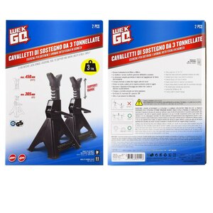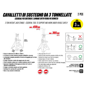 Cavalletti di sostegno da 3 tonnellate. Essenziali per sostenere il tuo veicolo in sicurezza. Regolabili: campo di sollevamento da 305mm a 450m. La struttura in acciaio resistente garantisce affidabilità e sicurezza. Le dimensioni compatte permettono di tenerlo nel bagagliaio per far fronte alle emergenze. Il design universale si adatta alla maggior parte dei veicoli. Finitura verniciata a polvere per la massima protezione contro la ruggine. Assicurare il dispositivo di bloccaggio per evitare che il carico si disinnesti accidentalmente. Il design a cricchetto consente una facile regolazione. Sella a V per prevenire lo slittamento. Certificato CE, marchiato GS e garantito TÜV