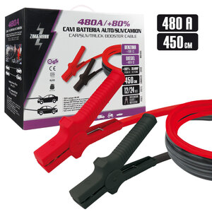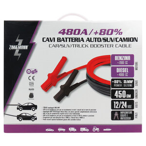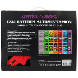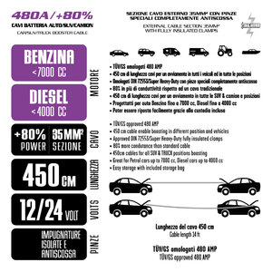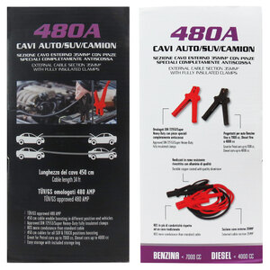 Cavi batteria per suv/camion. Cavi omologati DIN 72553 TUV ISO. Sezione cavo esterno 35mmq con pinze speciali completamente isolate antiscossa. Ideali per veicoli a benzina fino a 7000cc, veicoli diesel fino a 4000cc. 450cm di lunghezza cavi per poterli utilizzare in qualsiasi posizione dell'auto. 80% in più di conduttività rispetto ad un cavo tradizionale. Pratica borsa di stoccaggio in dotazione. 12/24V, 480A