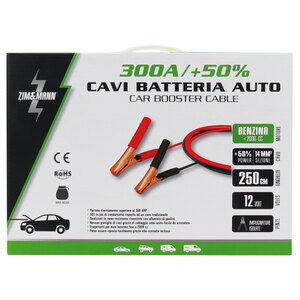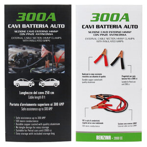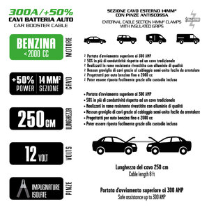 Cavi batteria per auto. Cavo con sezione esterna di 14mmq con pinze speciali con manici isolati antiscossa. Portata d'avviamento superiore a 300A. 50% in più di conduttività rispetto ad un cavo tradizionale. Realizzati in rame resistente riverstito con alluminio di qualità. Nessun groviglio di cavi grazie al cablaggio semi-unito facile da arrotolare. Progettati per auto benzina fino a 2000cc. 12V. Cavo 250cm