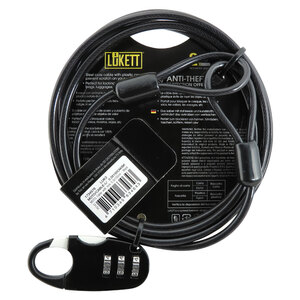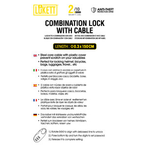 Lucchetto a combinazione con cavo. Il cavo con anima in acciaio e copertura in plastica evita di graffiare gli oggetti di valore. Perfetto per bloccare casco, biciclette, borse, valigie, in viaggio, ecc Diam. 0,3x150cm