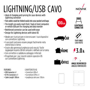 Cavo ideale per ricaricare e sincronizzare i tuoi dispositivi con connettore Lightning. Ricarica e sincronizza ad alta velocità. Prodotto con cavo dal design piatto anti-grovigli e facile da trasportare. Il cavo piatto può essere piegato facilmente nella vostra tasca o borsa. Grazie alla generosa lunghezza sarà ora più facile raggiungere la porta USB del computer o dell'auto per la ricarica. Con connettori e saldatura cablaggio rinforzati. Progettato per i più recenti sistemi operativi OS con connettore Lightning. 3.0A Angolo rinforzato. Lunghezza cavo: 100cm. Cavo piatto