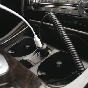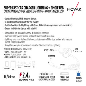 Caricabatterie super veloce Lightning + porta singola USB. Alimentate i vostri dispositivi in modo rapido ed efficiente. Cavo a spirale da 100cm. Compatibile con una vasta gamma di dispositivi elettronici. Indicatore a LED per localizzare facilmente il caricabatteria in auto. Cavo a spirale per evitare la formazione di nodi e aggrovigliamenti. Ingresso: DC 12V-24V. Uscita: 5V- 2.4A