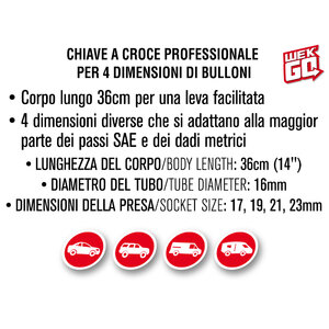 Chiave a croce professionale. Per 4 dimensioni diverse di bulloni (17-19-21-23mm) che si adattano alla maggior parte dei passi SAE e dei dadi metrici. parte centrale robusta. Corpo lungo per una leva facilitata