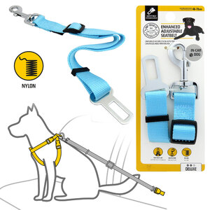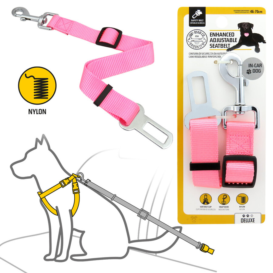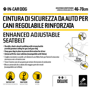 Cintura di sicurezza da auto per cani regolabile, rinforzata. Cinghia resistente e assorbi urti dotata di una fibbia forte per fornire la massima sicurezza. Misura universale che si adatta alla maggior parte dei veicoli (incompatibile con la Volvo). In poliestere. Peso massimo 32kg. Lunghezza regolabile da 46 a 70cm