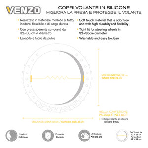 Coprivolante universale in silicone. Migliora la presa e protegge il volante. In materiale confortevole al tatto, inodore, flessibile e di lunga durata. Garantisce una presa aderente su volanti con diametro esterno compreso tra 32>38cm Lavabile, facile da pulire. Diametro interno: 26cm Diametro esterno: 32cm