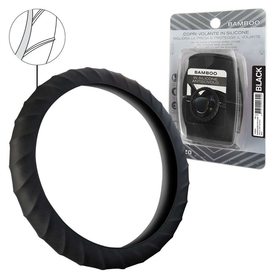 Coprivolante universale in silicone. Migliora la presa e protegge il volante. In materiale confortevole al tatto, inodore, flessibile e di lunga durata. Garantisce una presa aderente su volanti con diametro esterno compreso tra 34>40cm Lavabile, facile da pulire. Diametro interno: 25cm Diametro esterno: 34cm