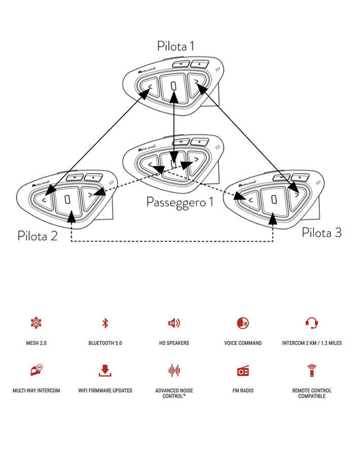 E' il prodotto che racchiude tutta la tecnologia al momento disponibile per gli interfoni: distanza fino a 8 km, musica condivisibile, chiamate condivisbili, qualità audio HD, multi lingua, compatibile "ok google" e "Hey Siri", e soprattutto l'esclusiva funzione SENA Mesh che permette di connettersi con un numero virtualmente illimitato di utenti e consente una connessione più stabile ricreando intelligentemente le connessioni perse quando un utente esce e/o rientra dal raggio d’azione.