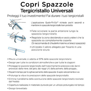 Coprispazzole tergicristallo universale. Protegge le spazzole tergicristallo dall'invecchiamento precoce e dai danni provocati dalla neve, dal gelo, dai raggi UV, dalla polvere, dalla pioggia, ecc. Misura universale: si adatta al 97% delle spazzole tergicristallo. Design per tutte le condizioni atmosferiche e per tutte le stagioni. L'applicazione Quick-Fit-Go richiede pochi secondi e mantiene le spazzole tergicristallo ben protette. Risparmi tempo per lo sghiacciamento delle spazzole. Si apre velocemente e via. Copertura realizzata in materiale durevole per un utilizzo prolungato nel tempo. Design brevettato