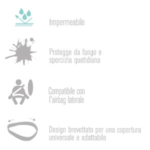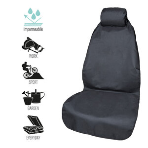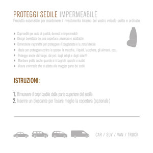 Proteggi sedile anteriore singolo di misura standard. Impermeabile. Poggiatesta integrato. Prodotto essenziale per mantenere il rivestimento interno del vostro veicolo pulito e ordinato. Protegge da fango e sporcizia quotidiana. Ideale per proteggere contro lo sporco, le macchie, i liquidi, la polvere, gli alimenti, ecc. Protegge anche dai peli degli animali, dagli artigli e dagli odori. Mantiene pulito anche quando si è bagnati, sporchi o sudati. Design brevettato per una copertura universale e adattabile alla maggior parte dei sedili. Compatibile con l'airbag laterale. Coprisedile di qualità, durevole e impermeabile