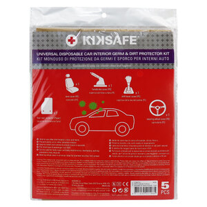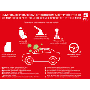 Kit monouso di protezione da germi e sporco per interni auto. Ideale da usare dopo la visita all'ospedale, clinica, fiere e... Previene macchie, olio o altri residui di inquinamento.. Facile da installare e rimuovere grazie all'elastico in soli pochi secondi. Il coprivolante è universale (ideale per un diametro inferiore a 38 cm). Si adatta alla maggior parte dei tipi di auto e SUV. Può essere utilizzato per la riparazione e la manutenzione quotidiana del veicolo, per l'utilizzo da parte di meccanici, parcheggiatori, carrozzeri ecc. Il kit include: 1x tappetino di protezione (Carta); 1x coprisedile (PE); 1x copertura del freno a mano (PE); 1x copertura della leva del cambio (PE); 1x coprivolante (PE)