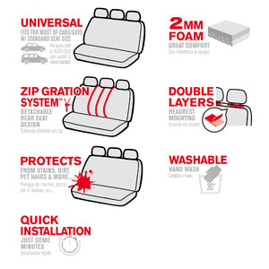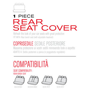 Coprisedile posteriore adatto a sedile posteriore a panca (e poggiatesta regolabile). Massima protezione ai vostri sedili rinnovando look e aspetto. Installazione facile e veloce. Misura universale che si adatta alla maggior parte dei sedili auto. Il particolare design ne garantisce la compatibilità con diversi formati e modelli di sedili grazie allo schienale divisibile con zip. Utili per proteggere il sedile da macchie, sporco, peli di animali, lacerazioni e molto altro... Apertura del poggiatesta a doppio strato con design semi-personalizzato per installare facilmente il poggiatesta. Contenuto: 1 coprisedile a panca posteriore (copri poggiatesta inclusi)
