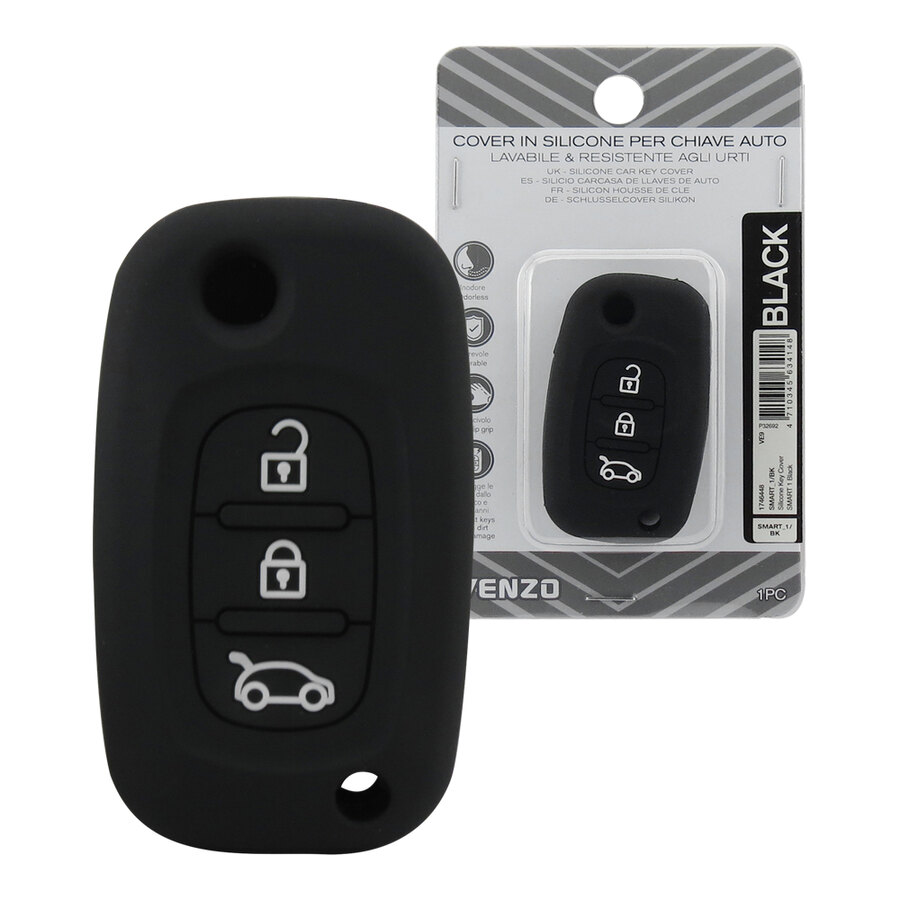 Cover in silicone per chiave auto. Realizzata in materiale morbido al tatto, inodore, di lunga durata e con design antiscivolo. Protegge le chiavi dallo sporco e dai graffi. Facile da installare in pochi secondi. Calzano perfettamente senza compromettere le funzionalità dei tasti. Lavabile e resistente agli urti. Compatibile con Smart modello: 453