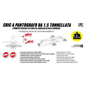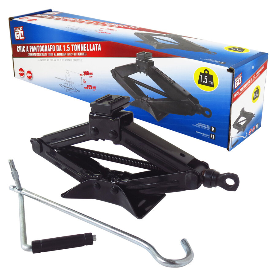 Cric a pantografo da 1.5 tonnellate. Struumento essenziale da tenere nel bagagliaio in caso di emergenza. Ampio range di sollevamento da 105mm a 390mm. La maniglia pieghevole consente di risparmiare fino al 30% dello spazio del bagagliaio. Rivestimento superiore in gomma per evitare graffi. La base oversize offre supporto e stabilità extra. Meccanica di precisione progettata per cambiare pneumatico. Finitura verniciata a polvere per la massima protezione contro la ruggine. La robusta struttura in acciaio garantisce affidabilità e sicurezza