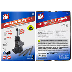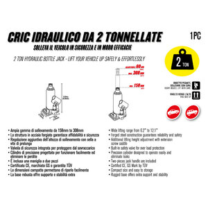 Cric idraulico da 2 tonnellate. Solleva il veicolo in sicurezza. Ampio range di sollevamento da 158mm a 308mm. La struttura in acciaio forgiato garantisce affidabilità e sicurezza. Valvola di sicurezza integrata per proteggere dal sovraccarico. Cilindro di precisione progettato per funzionare facilmente ed eliminare le perdite. La base robusta offre supporto e stabilità extra. Le dimensioni compatte permettono di riporlo facilmente. Certificato CE, marchiato GS e garantito TÜV