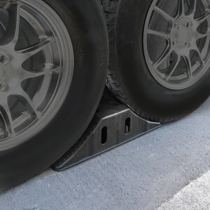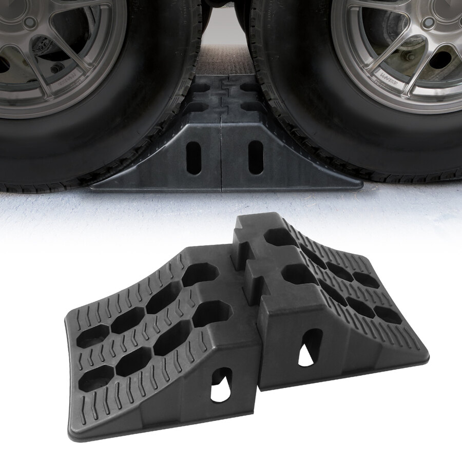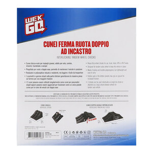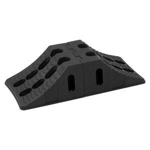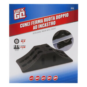 Cunei fermaruota ad incastro. Coppia cunei blocca-ruote per impieghi gravosi, adatto per auto, camion, rimorchi, fuoristrada o camper. Progettato per ruote a doppio asse, permette di mantenere il veicolo in posizione. Realizzati in polipropilene robusto e resistente, ma leggero e facile da trasportare. I cuscinetti in gomma situati nella parte inferiore garantiscono la massima presa sul terreno per una maggiore trazione. I 2 cunei possono essere utilizzati singolarmente come cunei per pneumatici singoli oppure possono essere agganciati per funzionare come un unico grande cuneo per le ruote dei veicoli con doppio asse. Compatibili con ruote fino a 66cm (spazio minimo richiesto tra 2 pneumatici 17,8cm). Dim. singolo cuneo: 21x23xh11,5cm. Dim. cuneo doppio: 21x45xh11,5cm. Verificare sempre le dimensioni del pneumatico prima di procedere all'acquisto