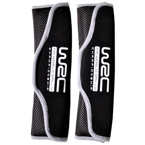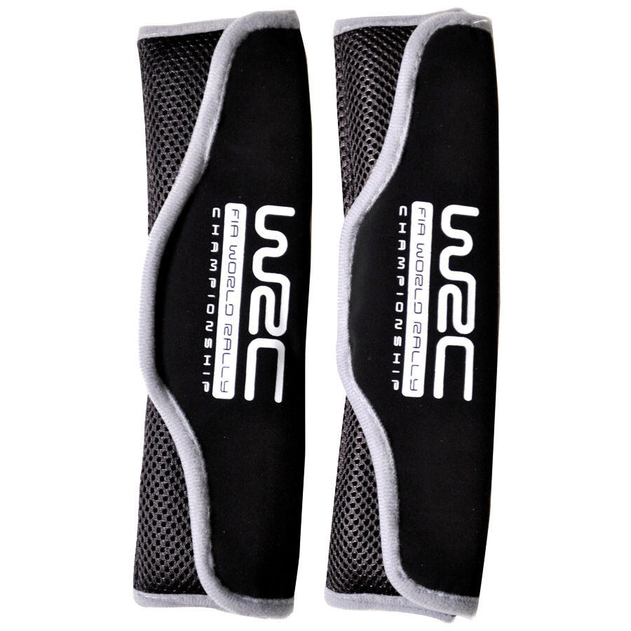 Coppia cuscinetti cintura di sicurezza dal look sportivo. Rendono meno opprimente l'uso delle cinture. Chiusura con velcro. Colore nero con ricamo WRC bianco, bordo grigio